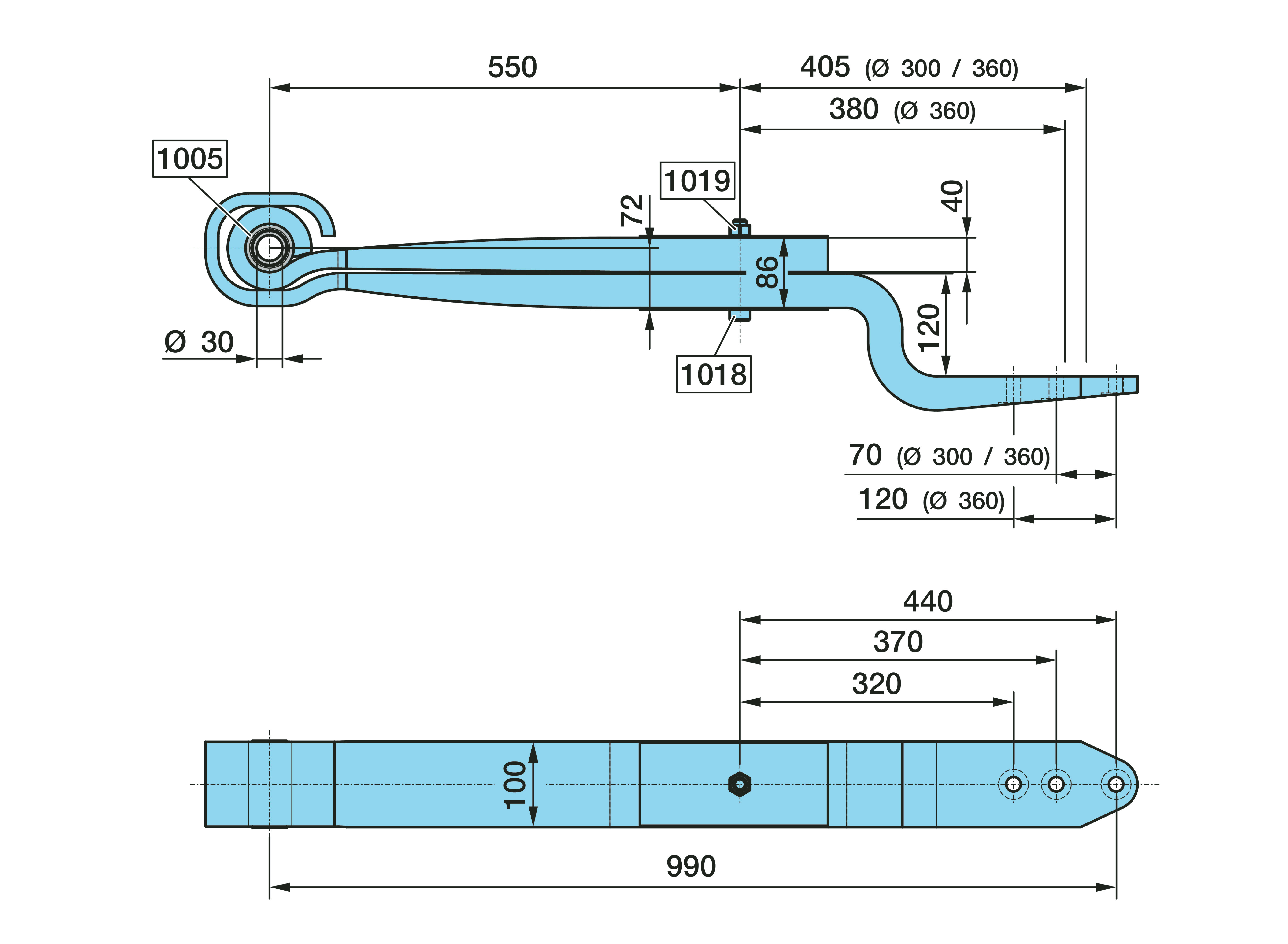 Dimension: Ø 30, 120, 2 x 40 / 100, L1 550 / 380/405