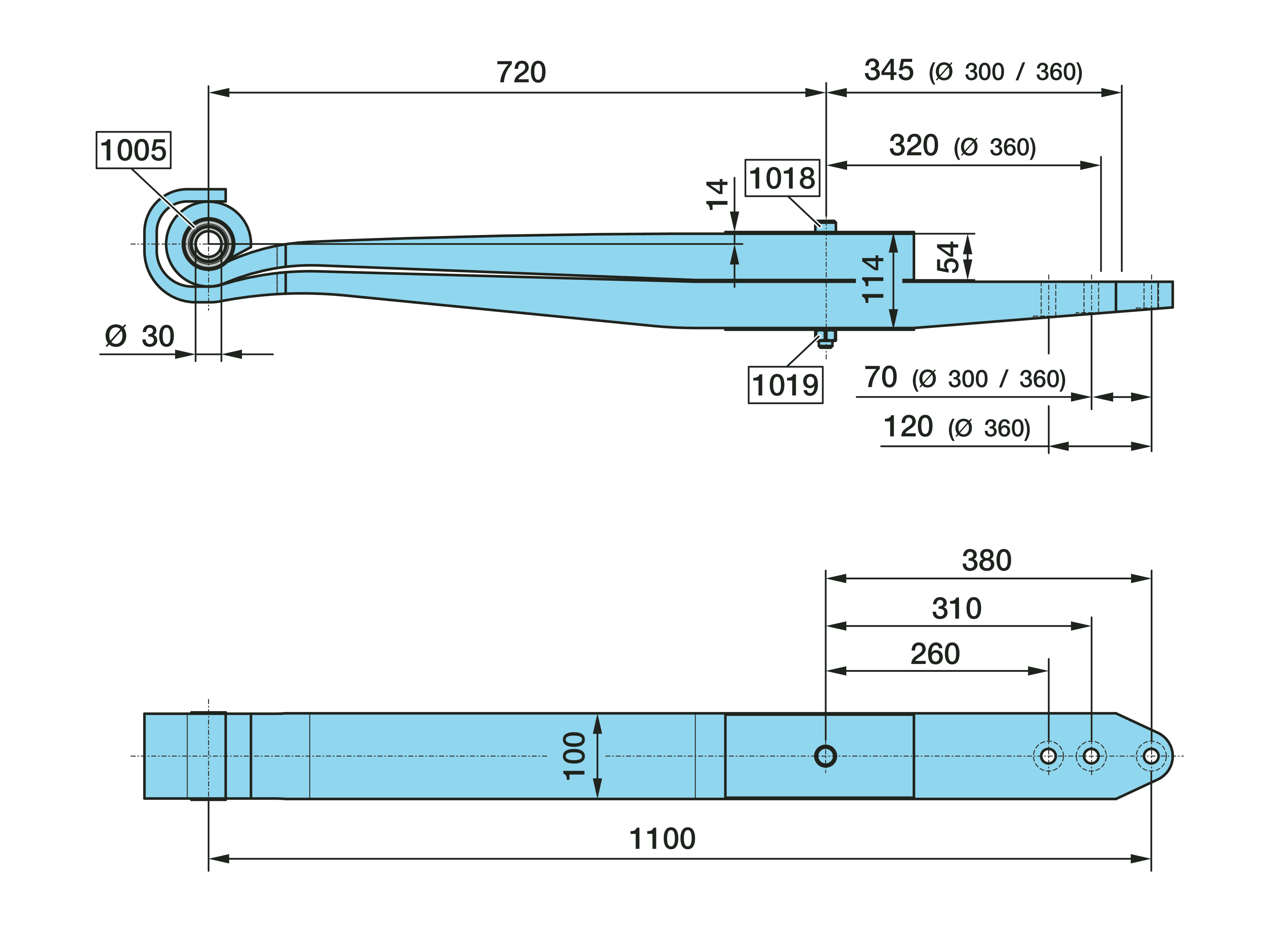 Dimension: Ø 30, 2 x 54 / 100, L1 720 / 320/345