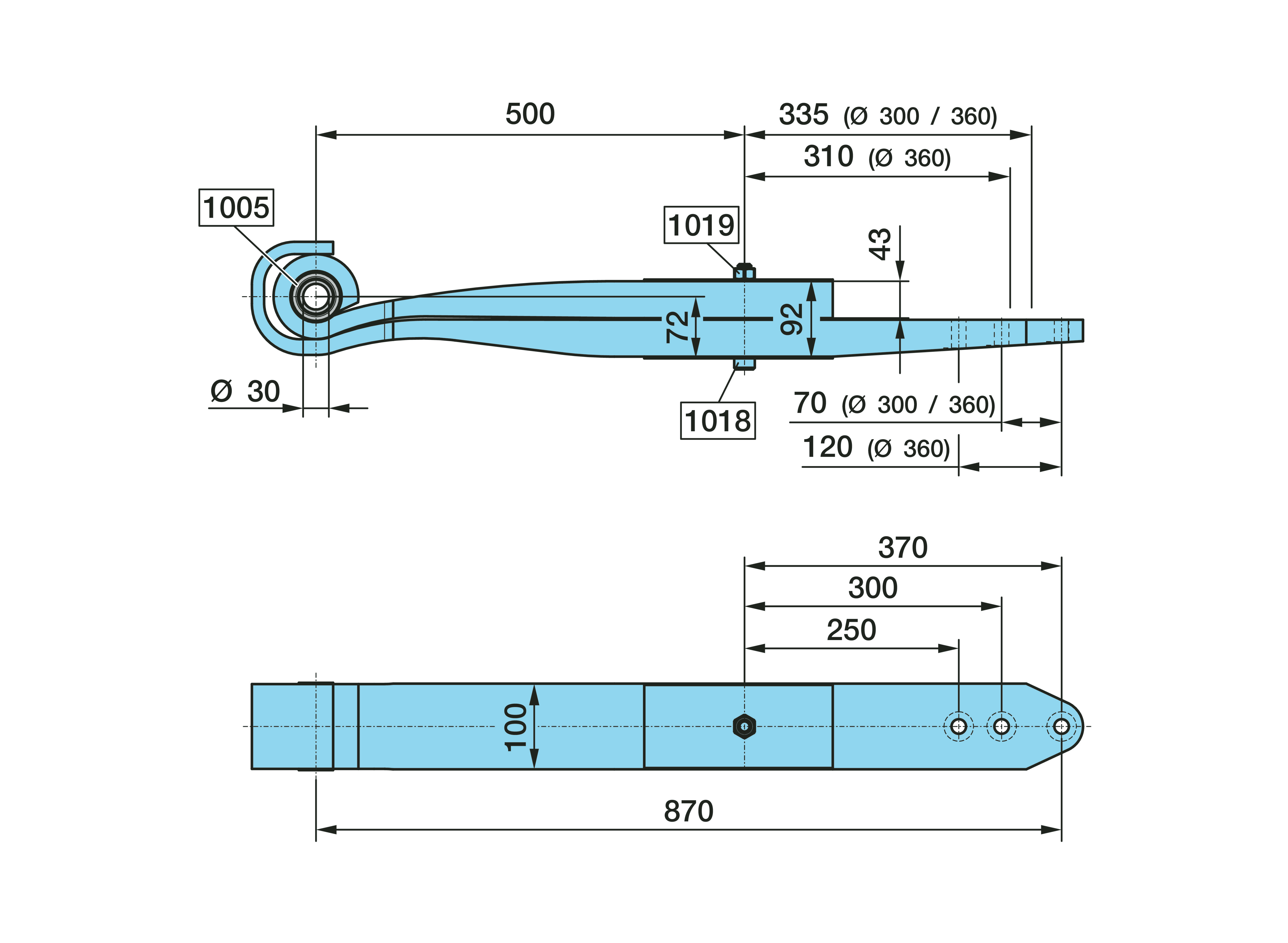 Dimension: Ø 30, 2 x 43 / 100, L1 500 / 310/335