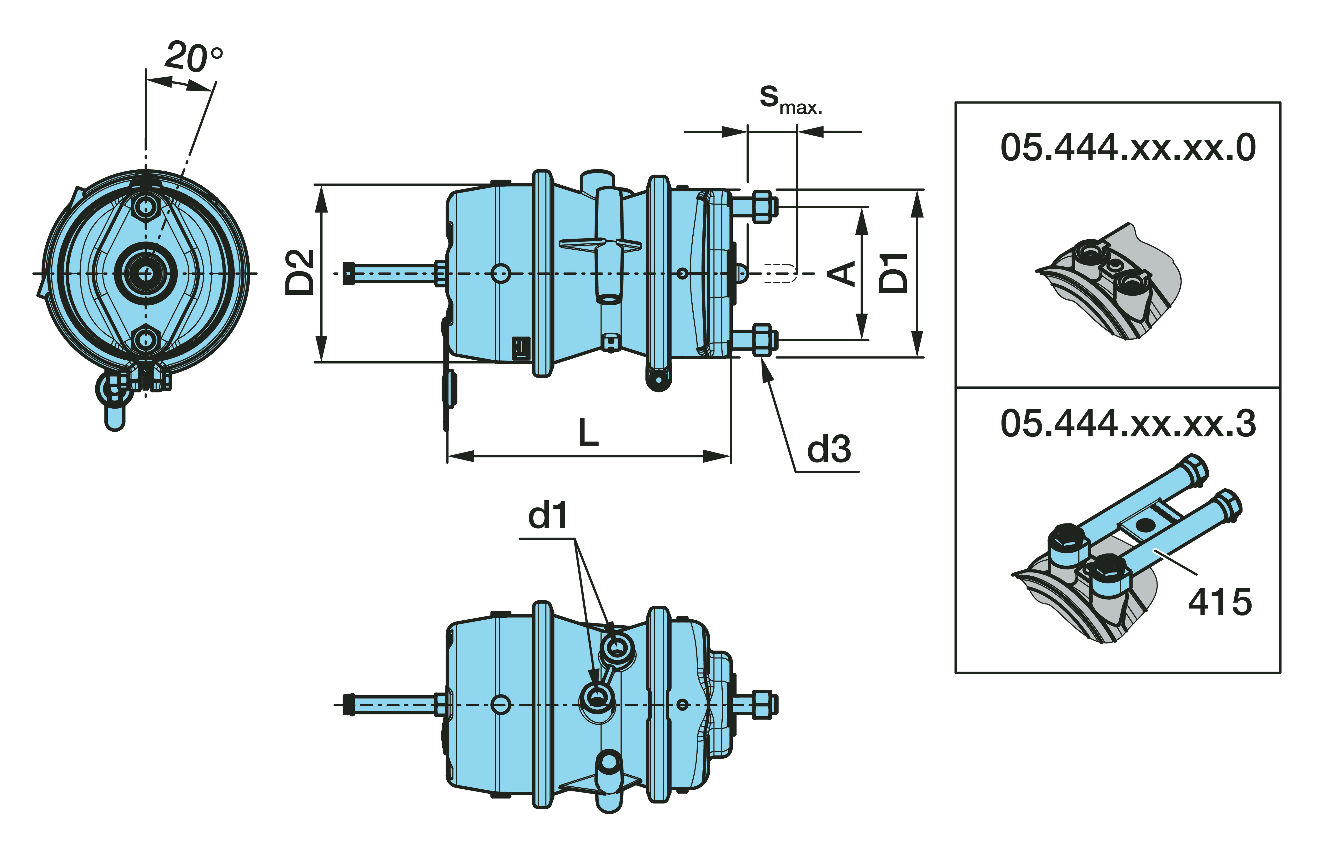 05.444.44.03.3 Jousikuormitettu sylinteri1 JOUSIJARRUSYL. EAC 20/24"L K/K DLAV Levyjarrulle EAC 20°