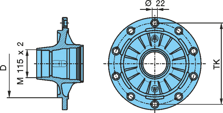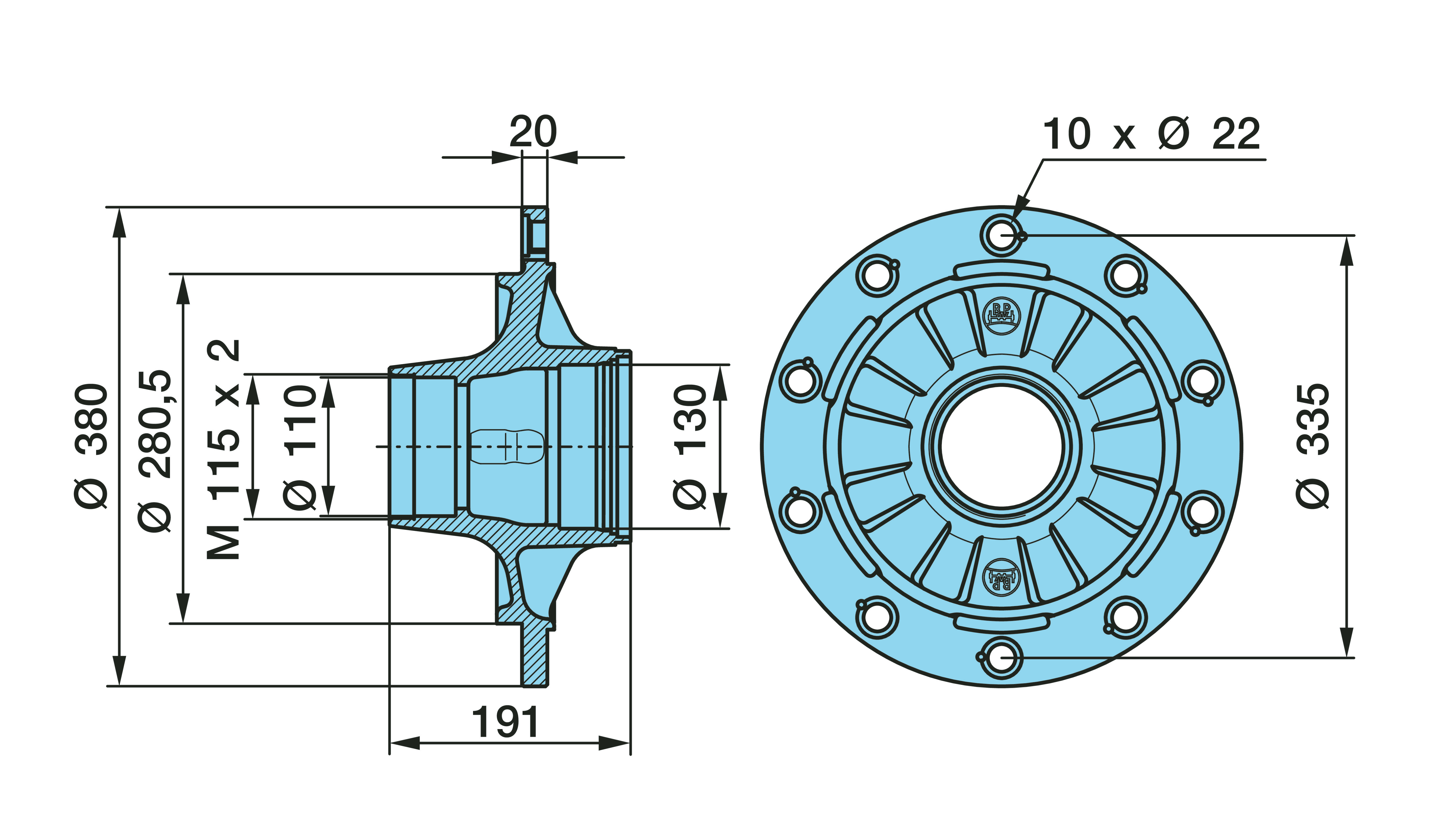 Dimension: M 115 x 2 / Ø 110/130 / 280,5 / 10 x Ø 22 / 335