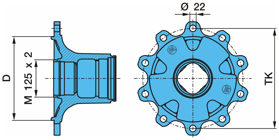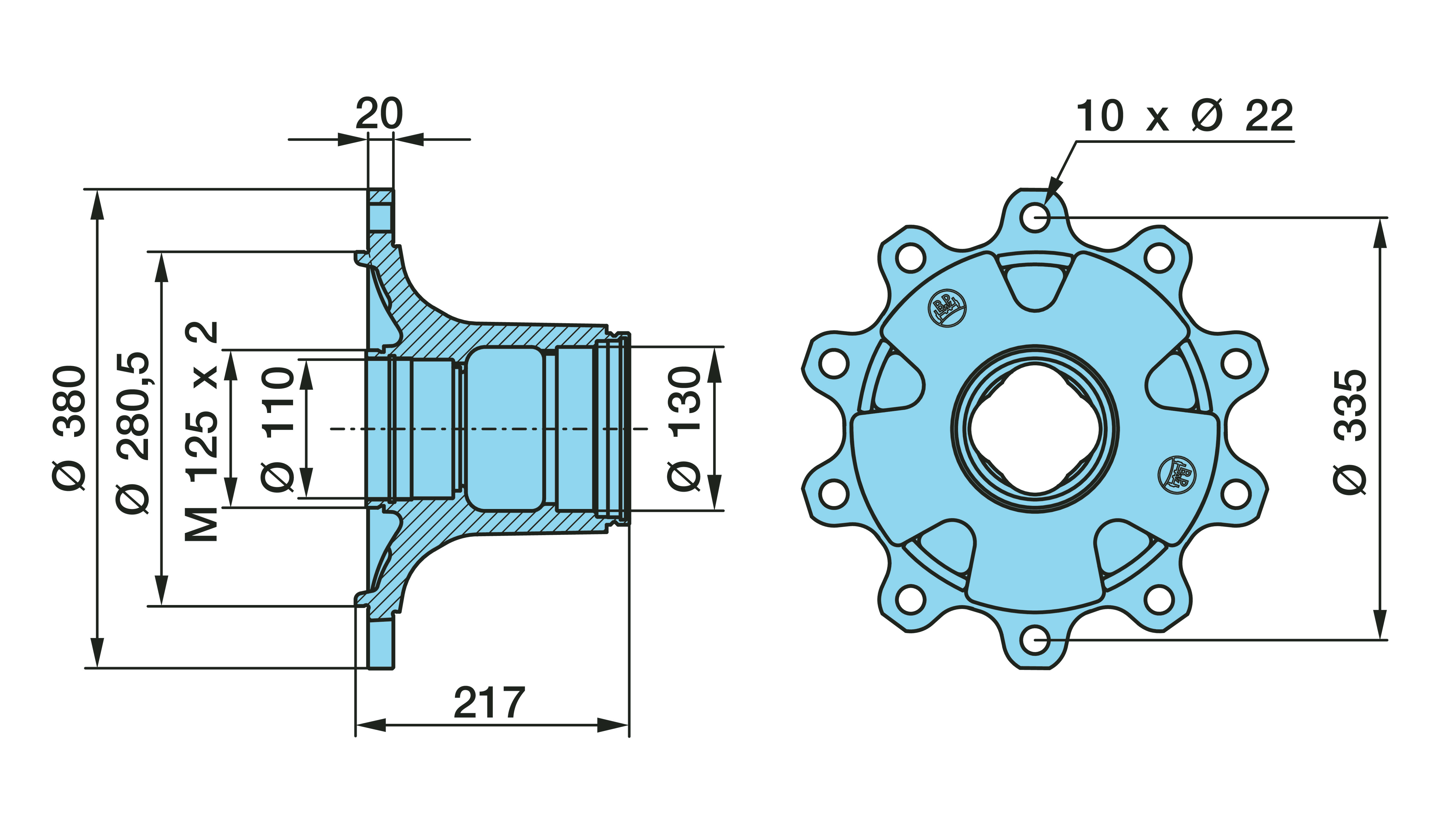 Dimension: M 125 x 2 / Ø 110/130 / 280,8 / 10 x Ø 22 / 335