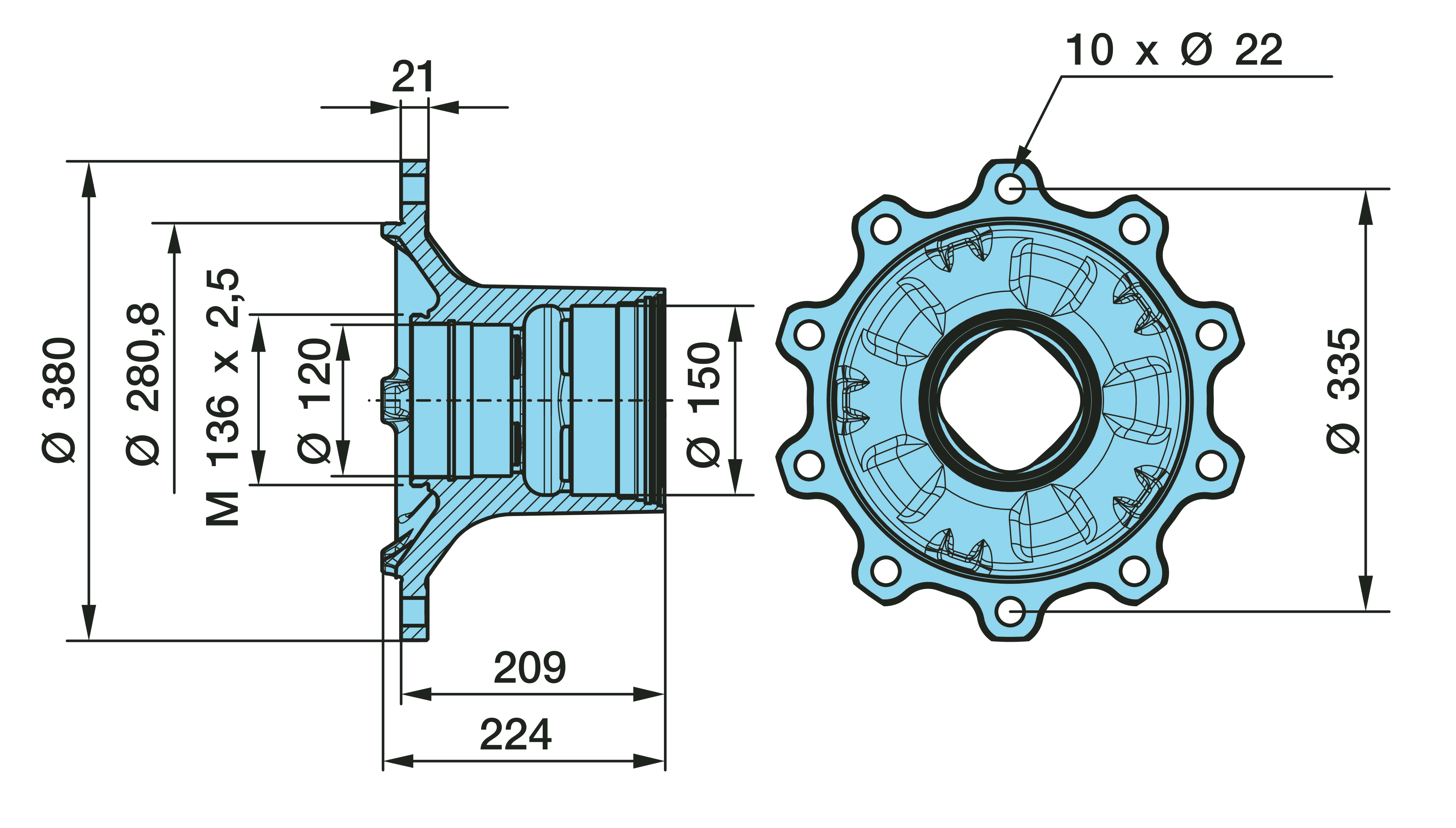 Dimension: M 136 x 2,5 / Ø 120/150 / 280,8 / 10 x Ø 22 / 335