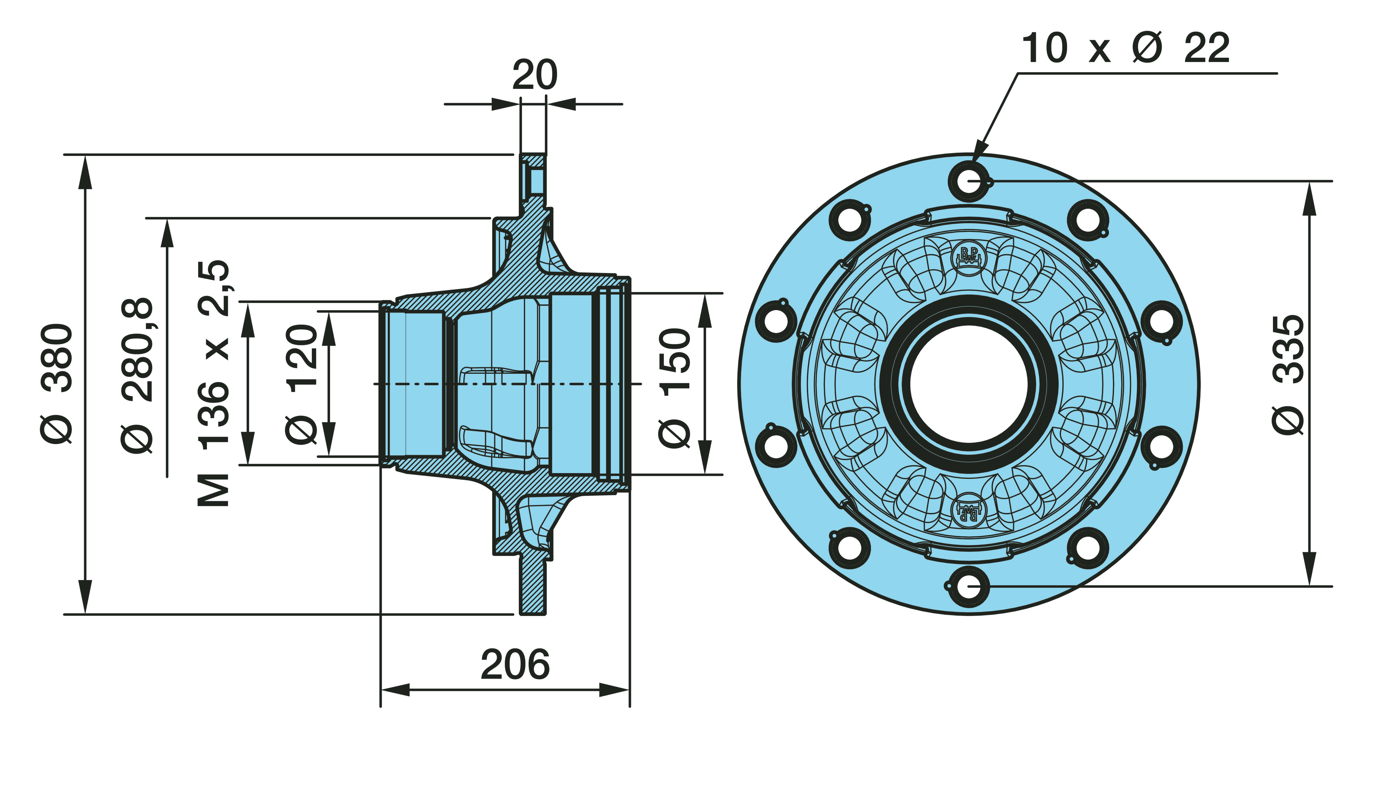 Dimension: M 136 x 2,5 / Ø 120/150 / 280,8 / 10 x Ø 22 / 335