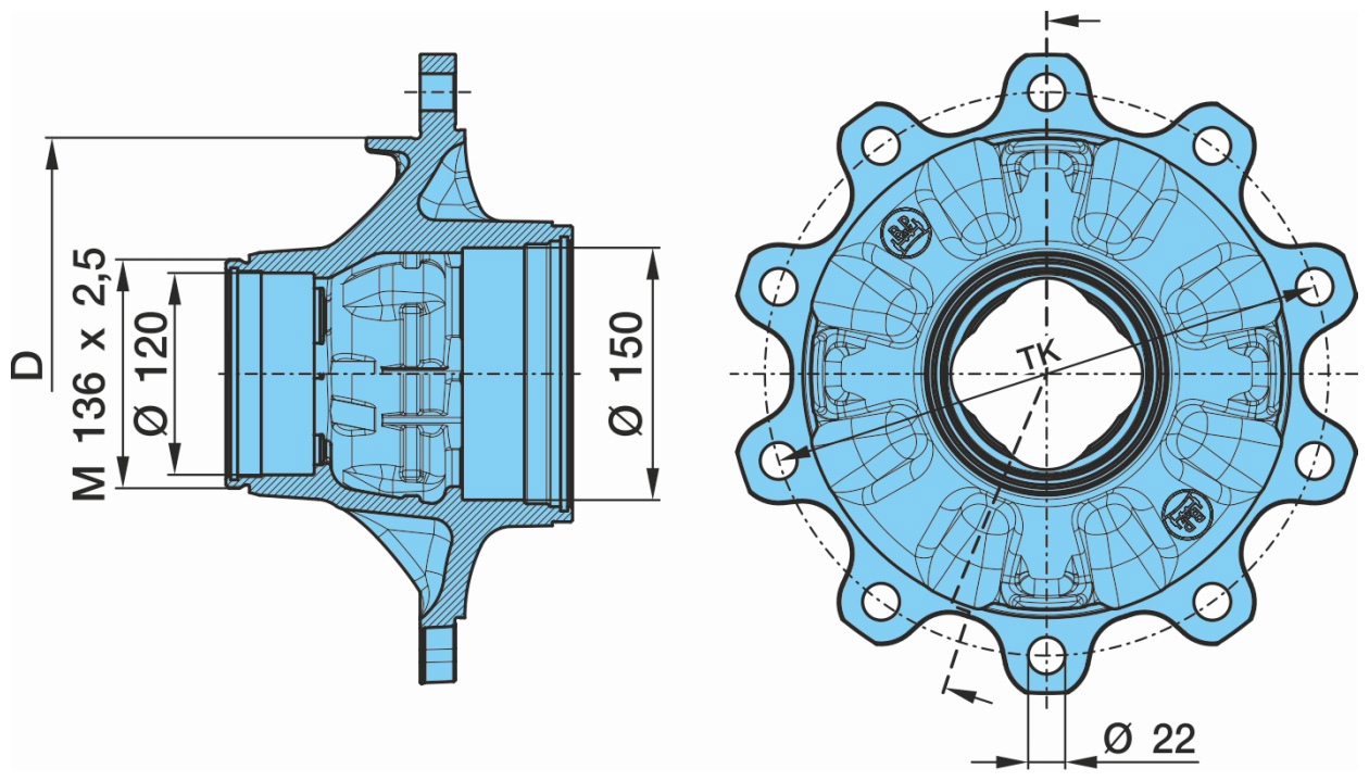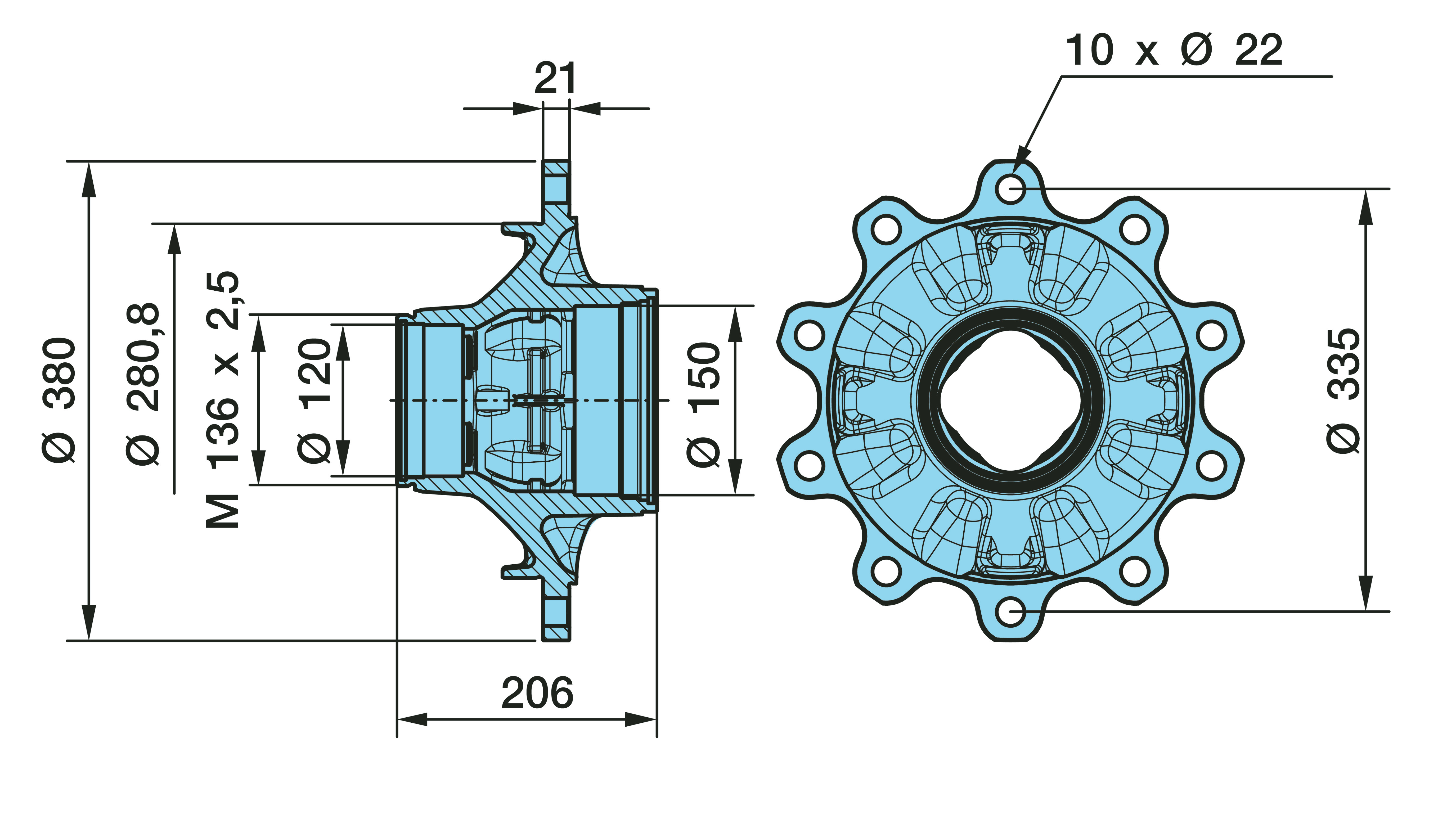 Dimension: M 136 x 2,5 / Ø 120/150 / 280,8 / 10 x Ø 22 / 335