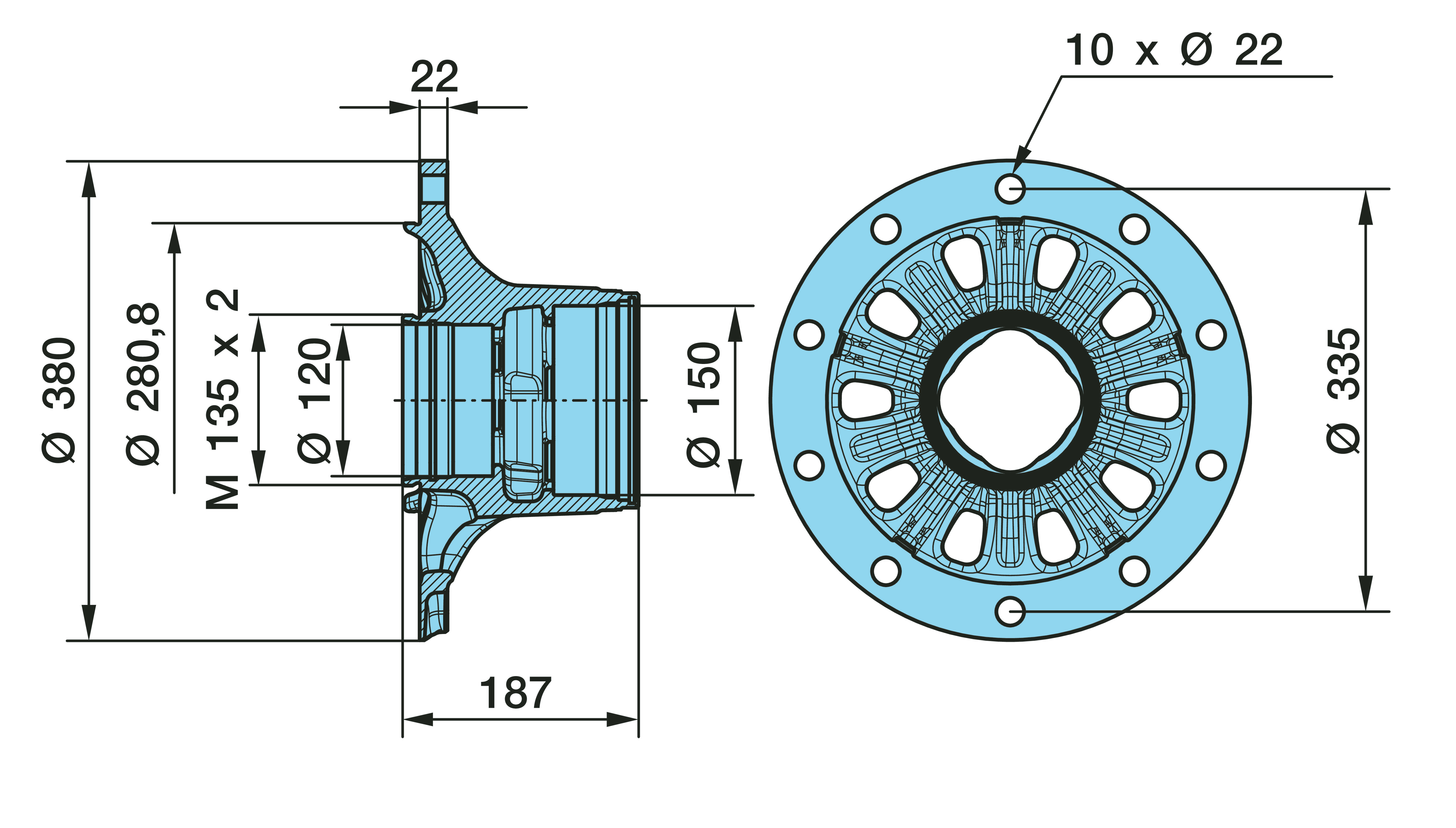 Dimension: M 135 x 2 / Ø 120/150 / 280,8 / 10 x Ø 22 / 335