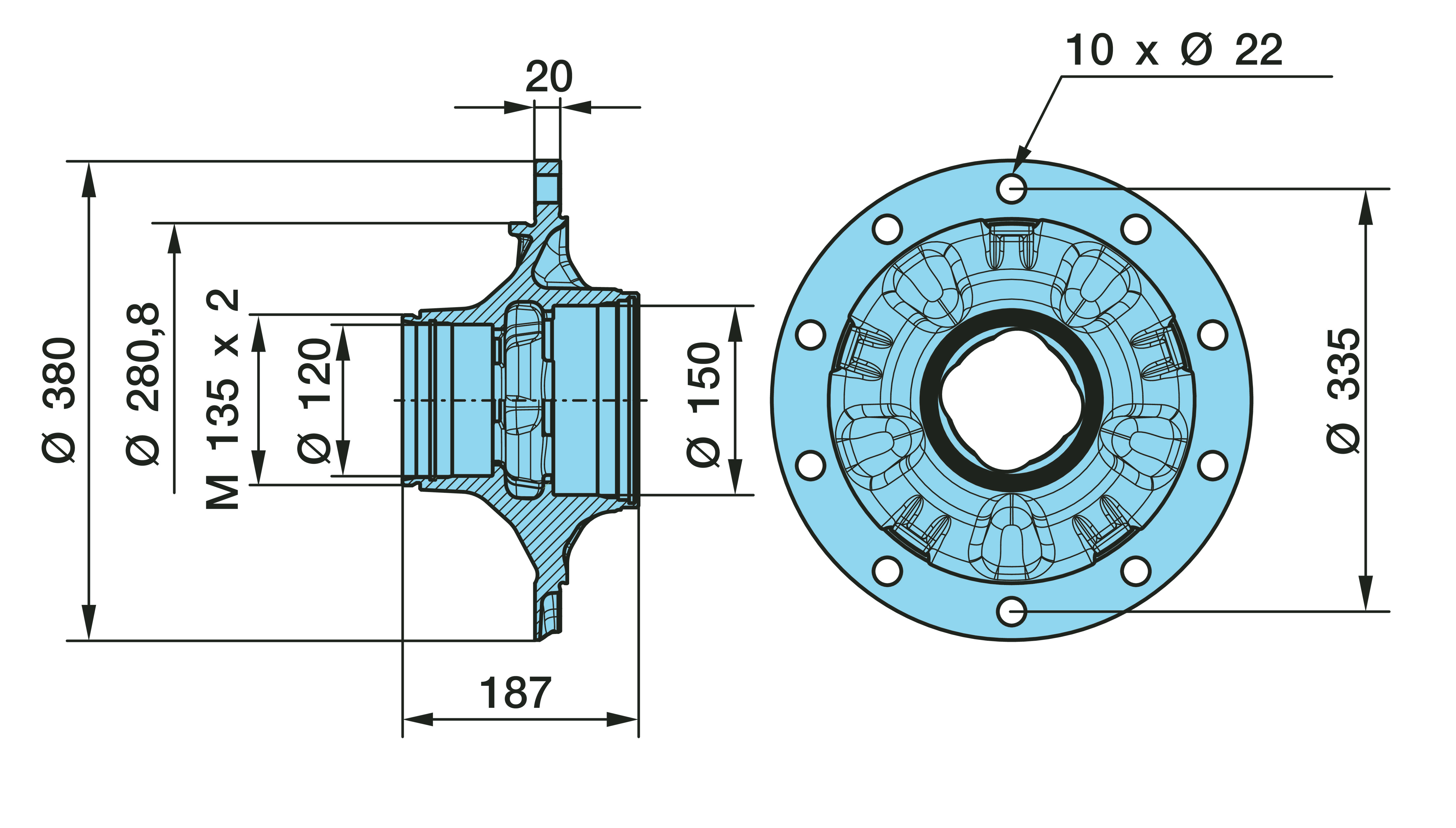 Dimension: M 135 x 2 / Ø 120/150 / 280,8 / 10 x Ø 22 / 335
