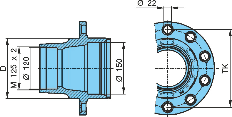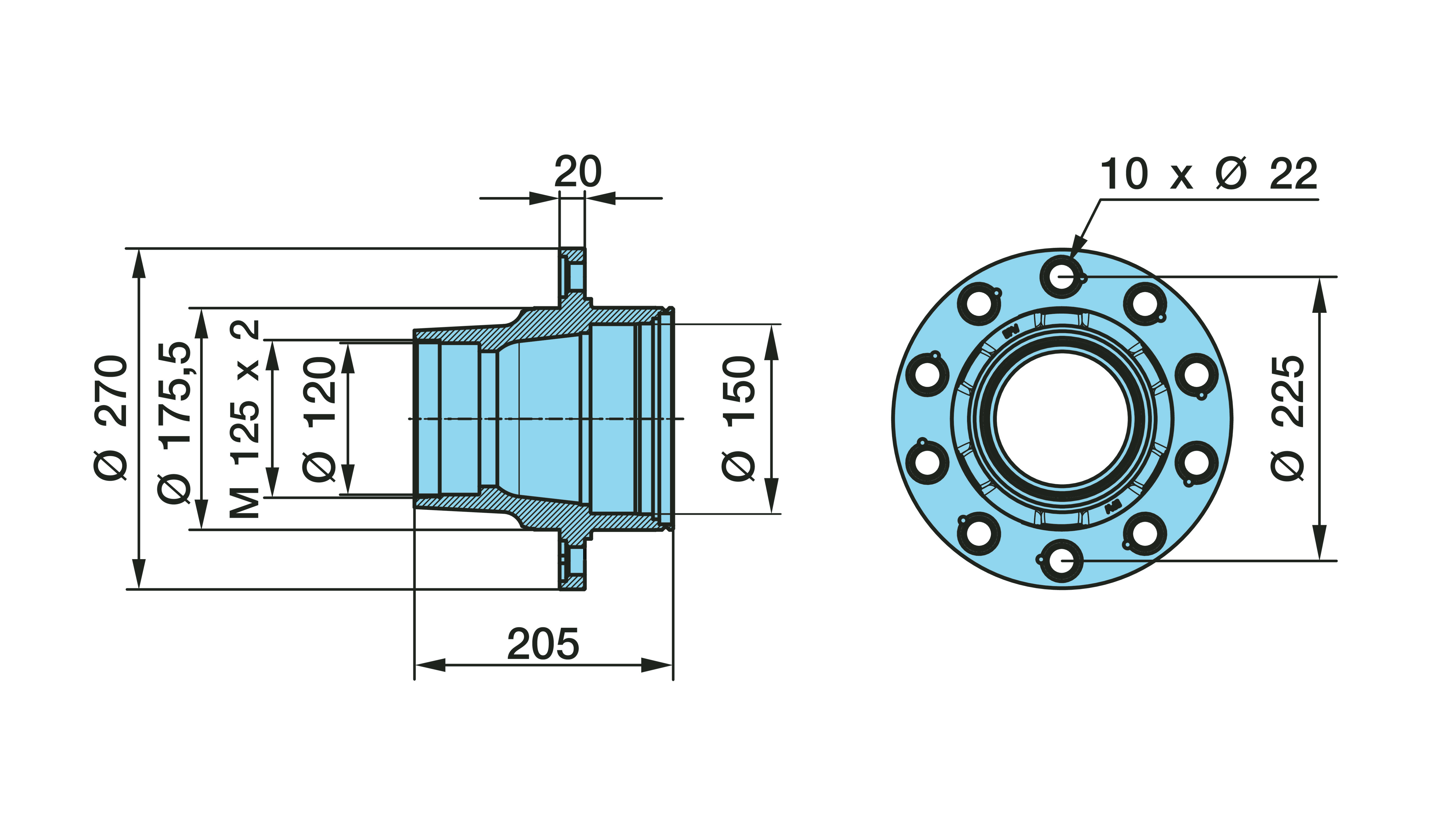 Dimension: M 125 x 2 / Ø 120/150 / 175,8 / 10 x Ø 22 / 225