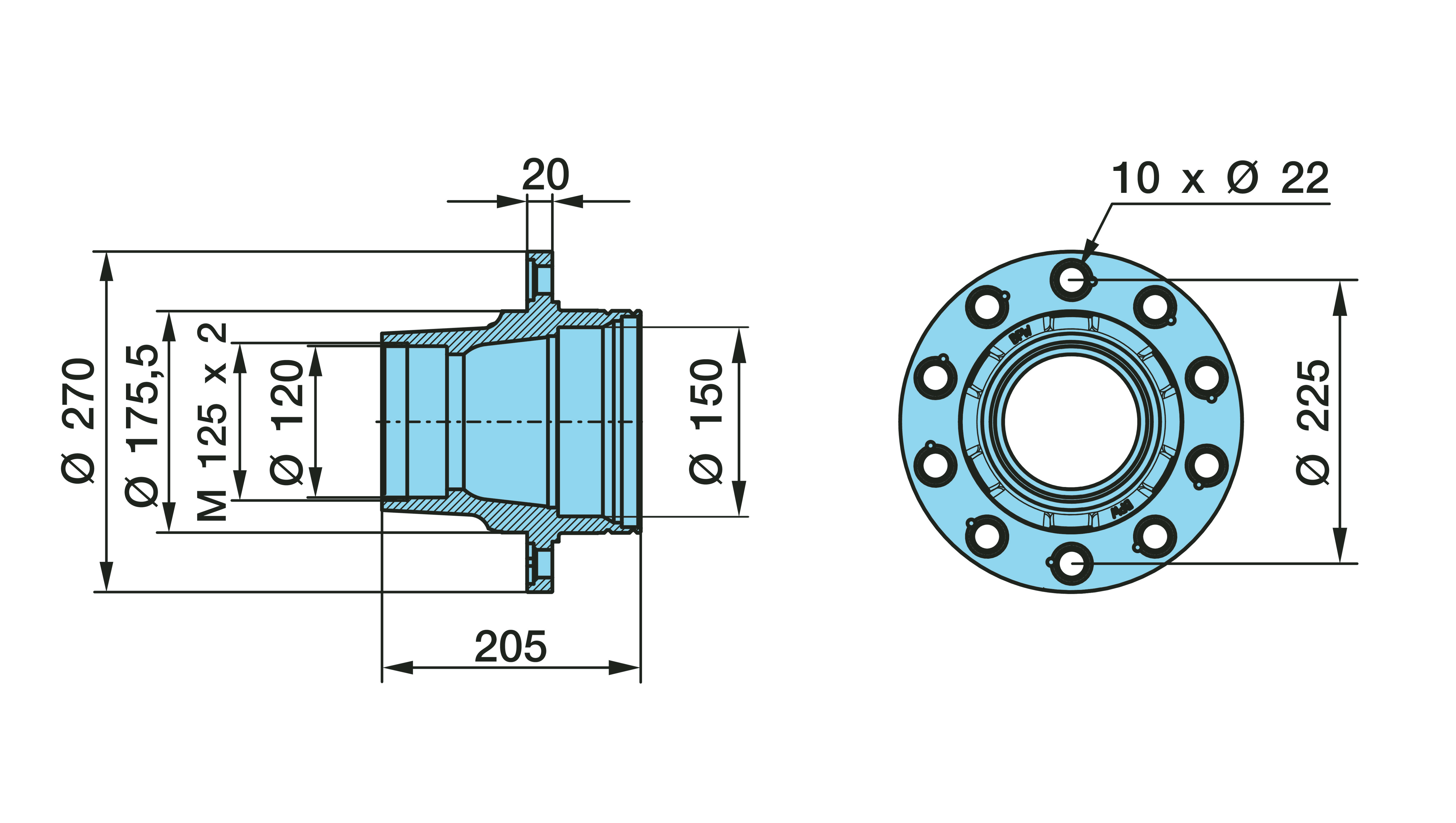 Dimension: M 125 x 2 / Ø 120/150 / 175,8 / 10 x Ø 22 / 225