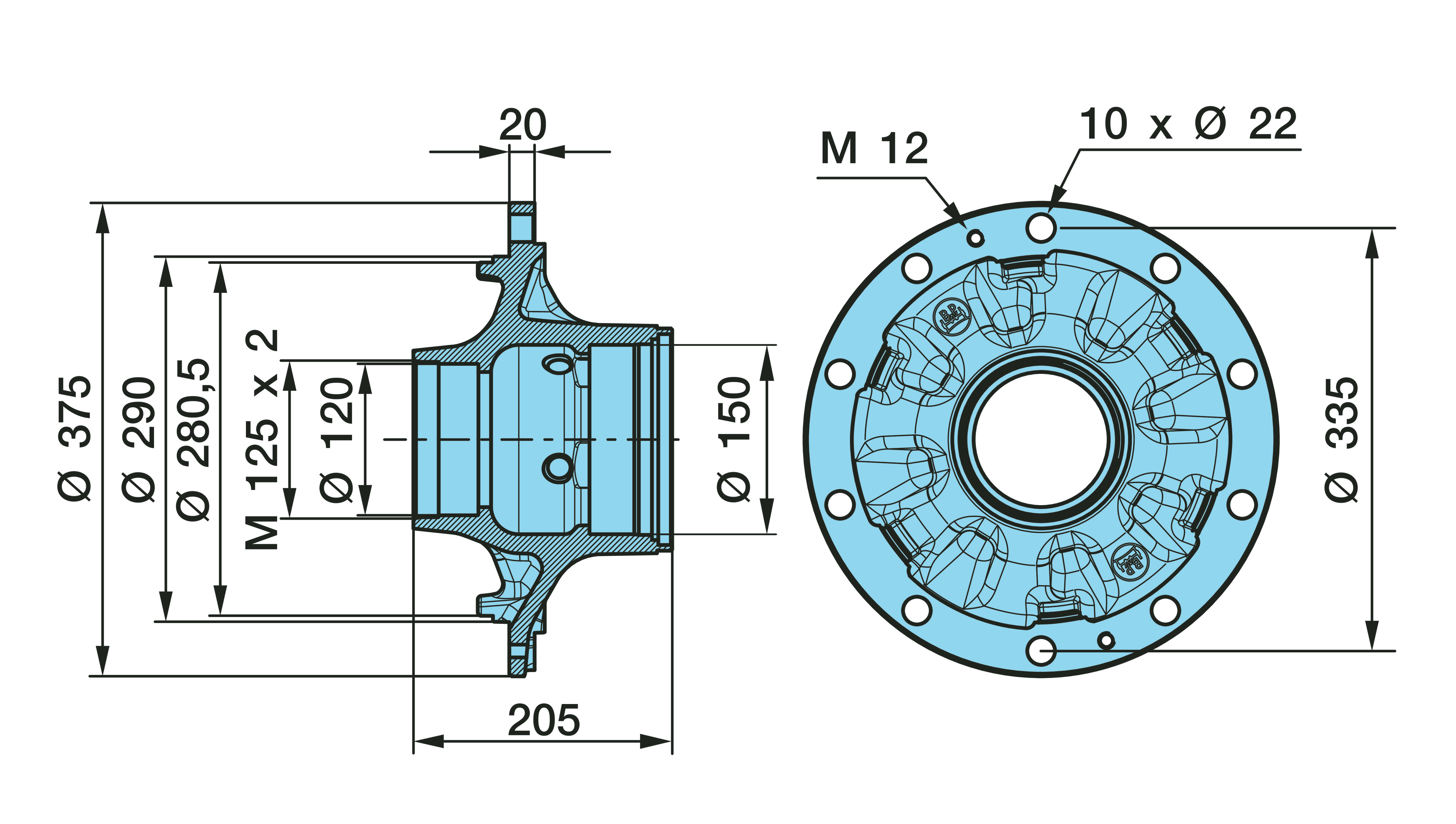 Dimension: M 125 x 2 / Ø 120/150 / 280,5/290 / 10 x Ø 22 / 3