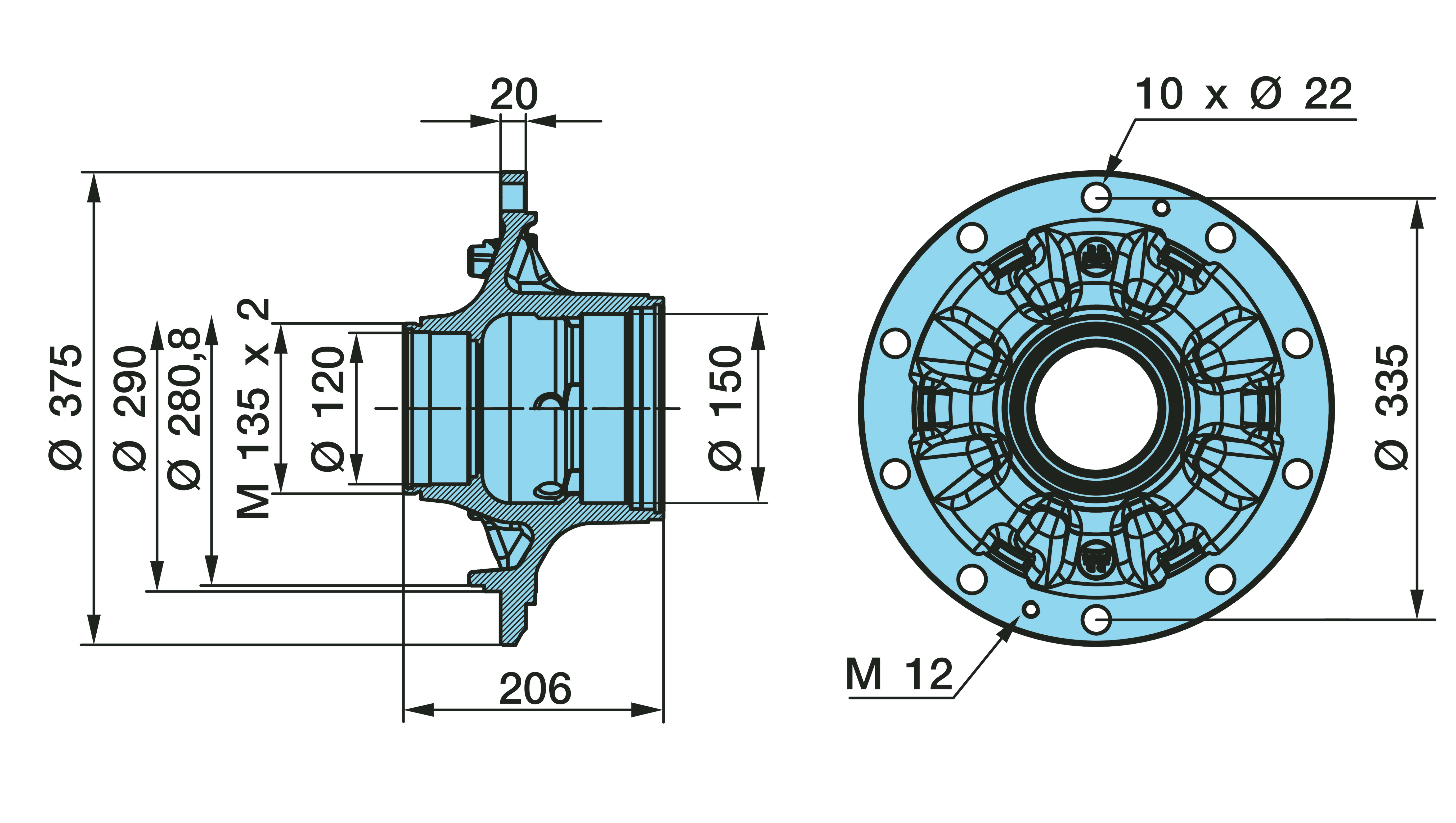 Dimension: M 135 x 2 / Ø 120/150 / 280,8/290 / 10 x Ø 22 / 3