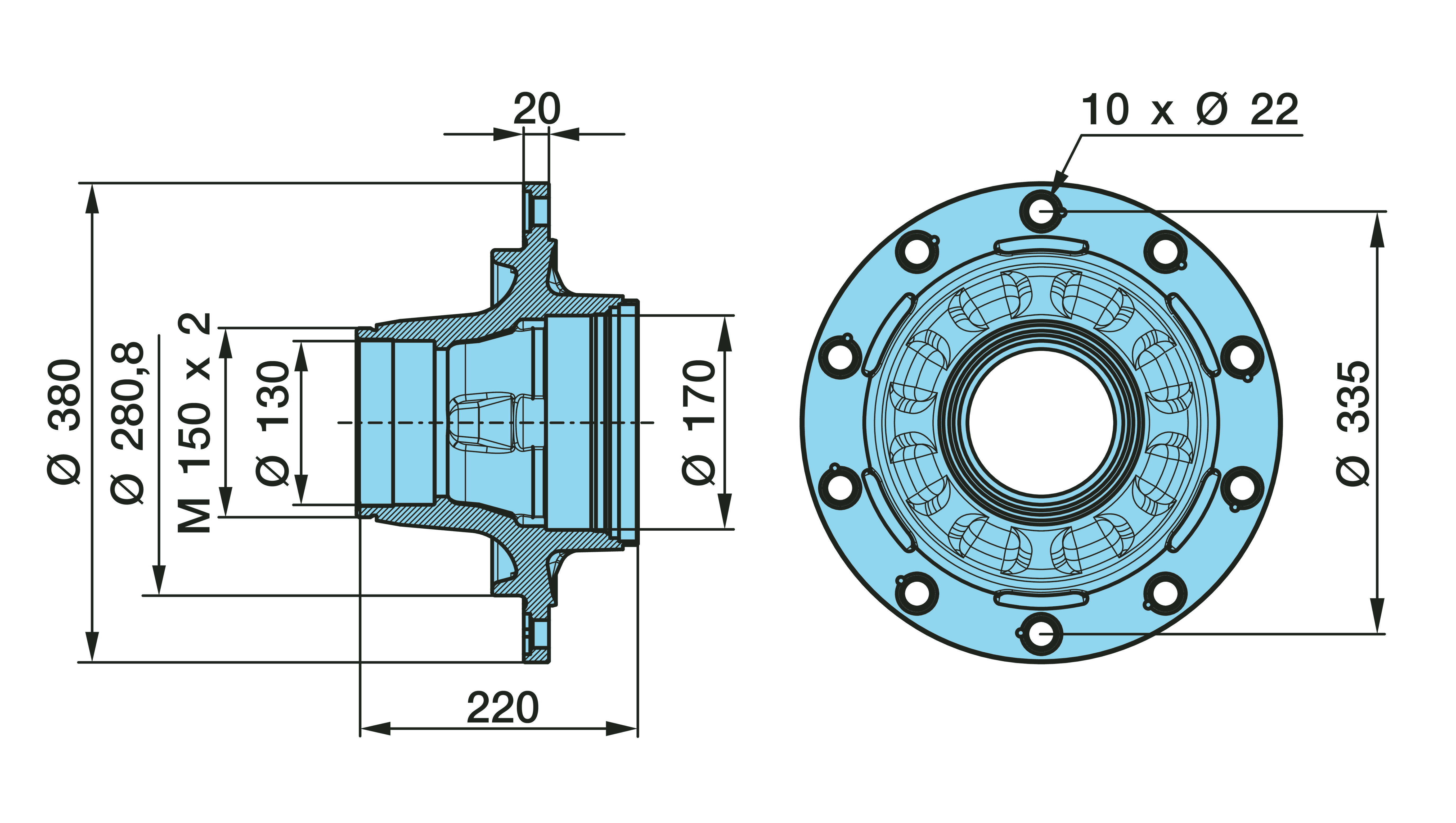 Dimension: M 150 x 2 / Ø 130/170 / 280,8 / 10 x Ø 22 / 335