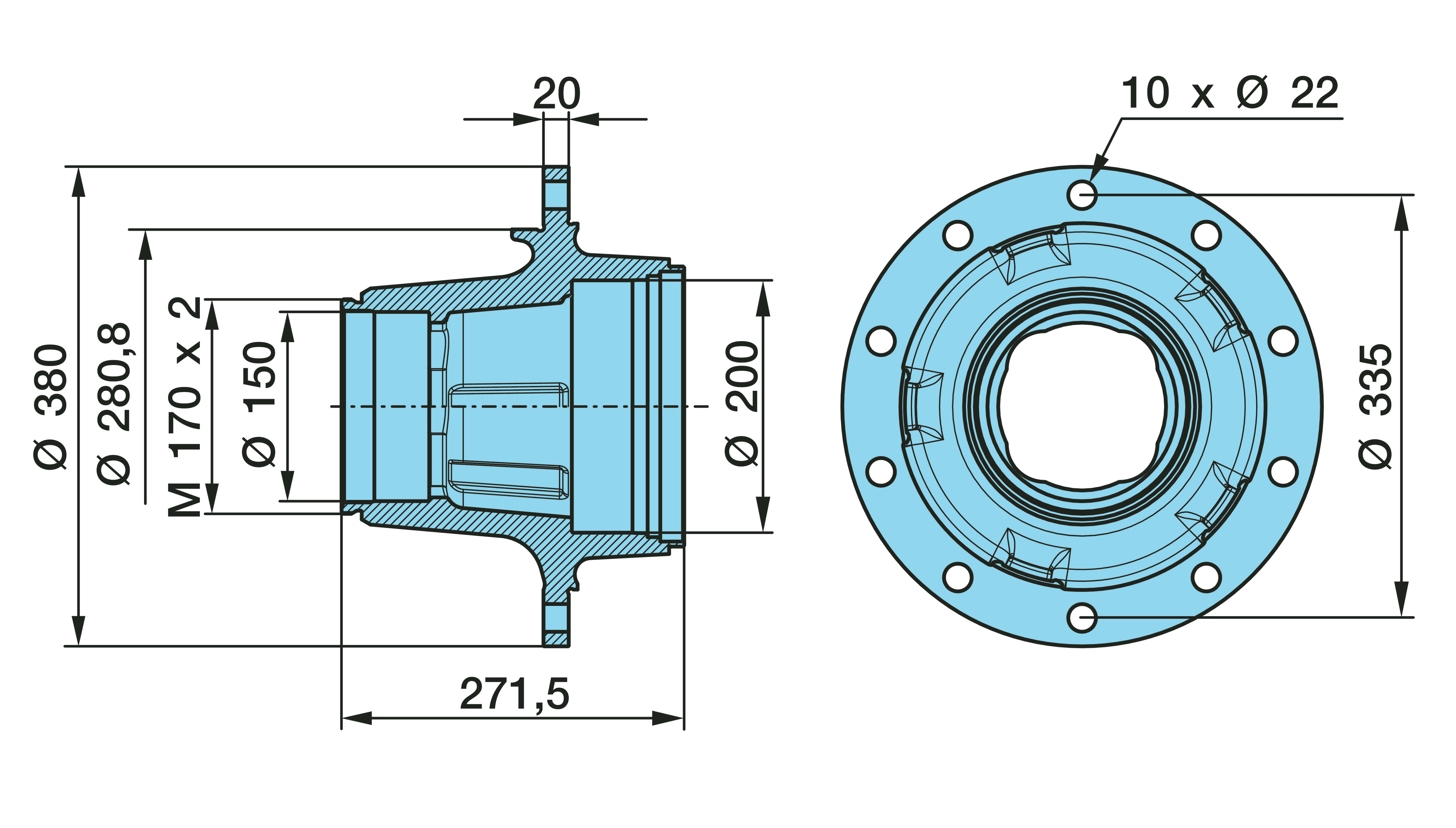 Dimension: M 170 x 2 / Ø 150/200 / 280,8 / 10 x Ø 22 / 335