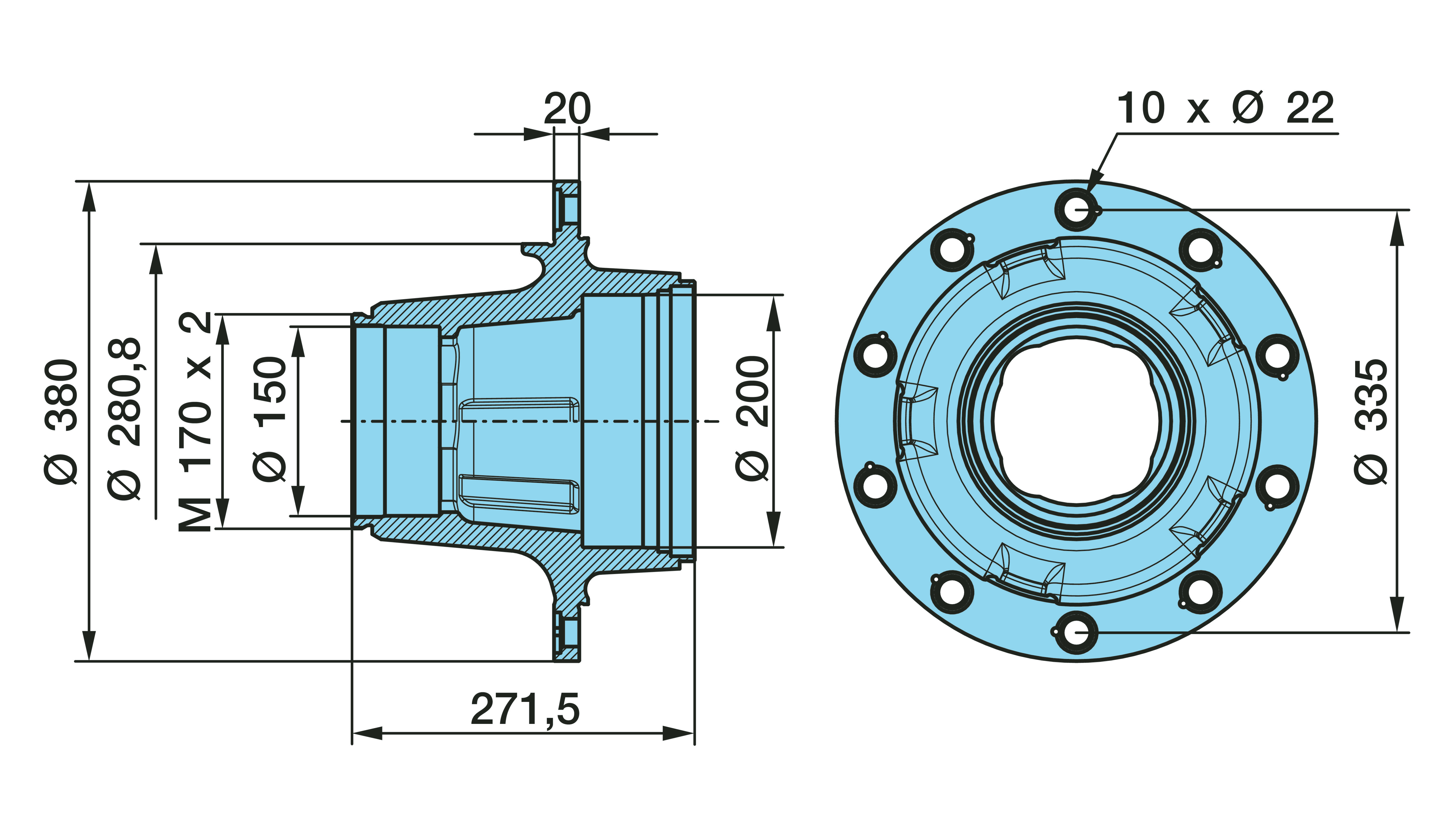 Dimension: M 170 x 2 / Ø 150/200 / 280,8 / 10 x Ø 22 / 335