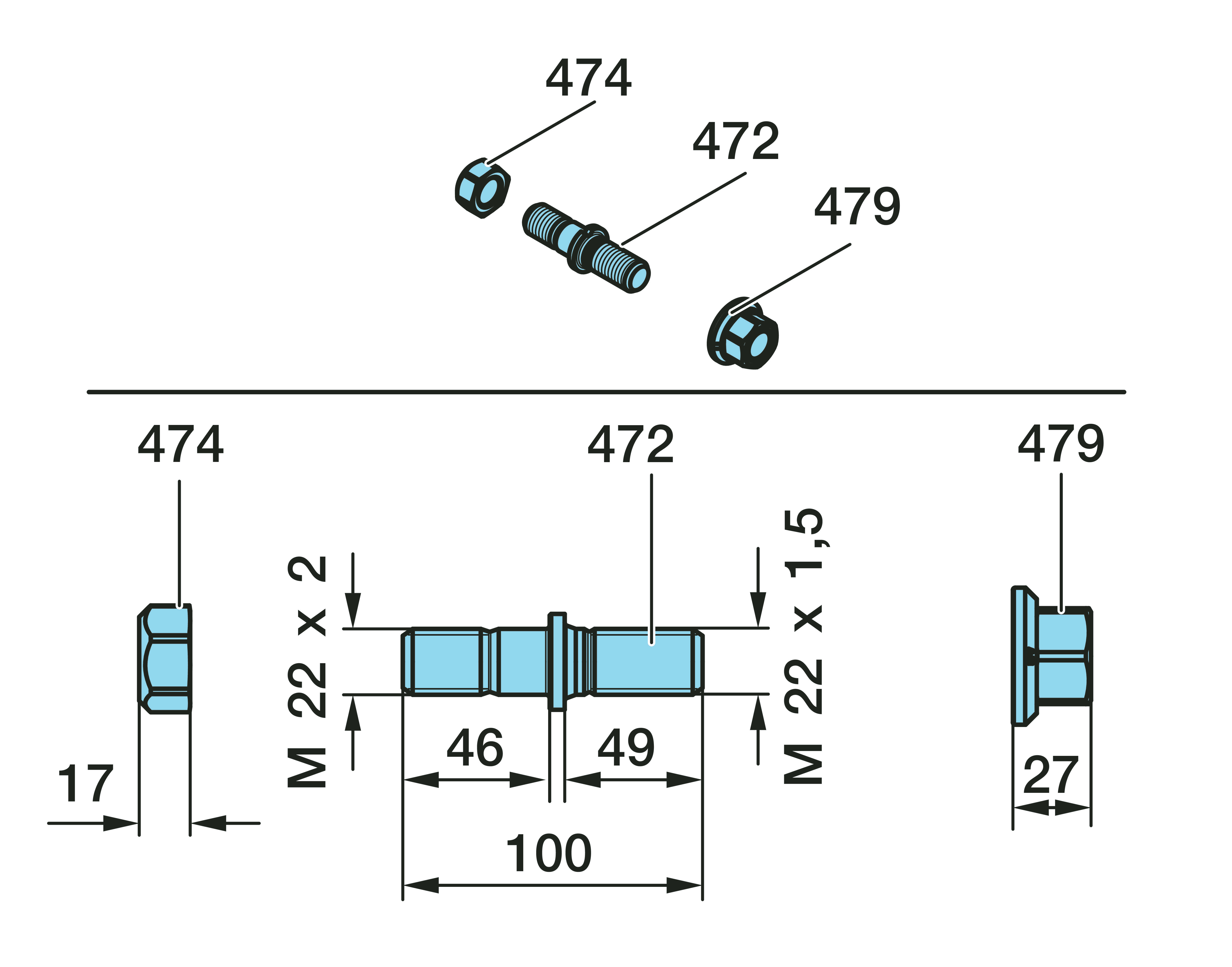 Dimension: M 22 x 1,5 / M 22 x 2 / 100 / 46 / 49